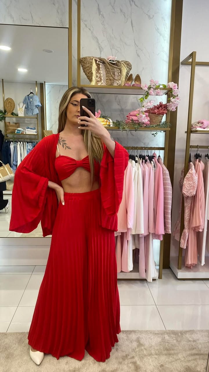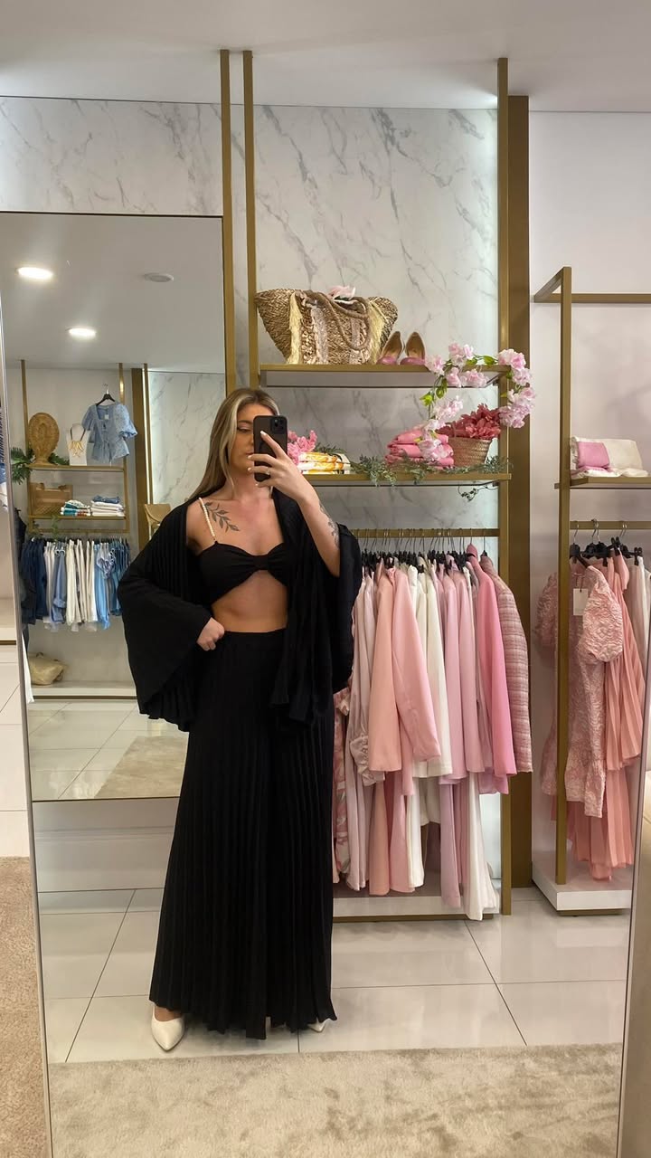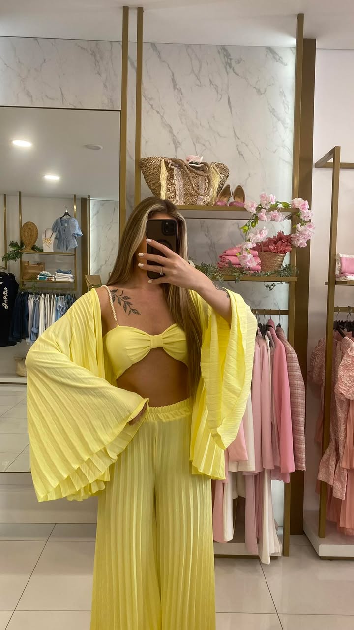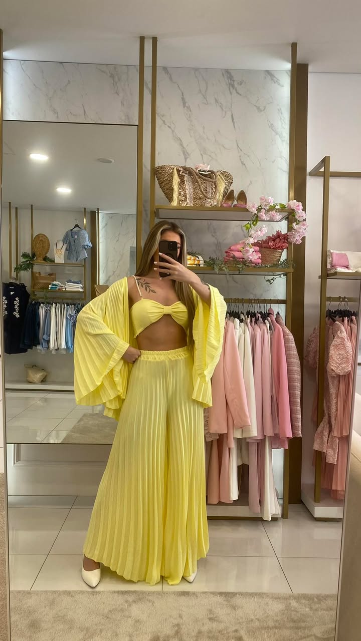 Um trio perfeito para dias de elegância descontraída. Este conjunto une fluidez, textura e brilho subtil num coordenado que se destaca pela leveza dos plissados e pelos detalhes delicados em cada peça.